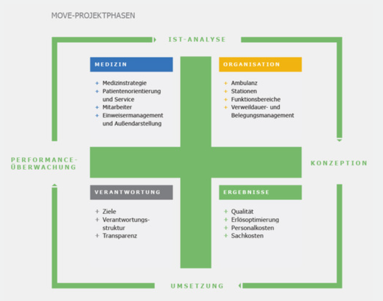 Auch in dieser Dimension liegt das Erfolgsgeheimnis in der gleichzeitigen Umsetzung verschiedener Maßnahmen zur Erlös- und Kostenoptimierung. Nachhaltig wird der Ansatz vor allem aber dadurch, dass die Erfolgsgrößen Qualität und Wirtschaftlichkeit gleichsam positiv beeinflusst werden. Dies führt zu überdurchschnittlichen Ergebnissen: so konnten wir z. B. den Case Mix einer Klinik um 16% erhöhen, die Verweildauer einer anderen Abteilung um 1,86 Tage senken und das betriebswirtschaftliche Ergebnis einer Klinik um 1,6 Mio. Euro verbessern.