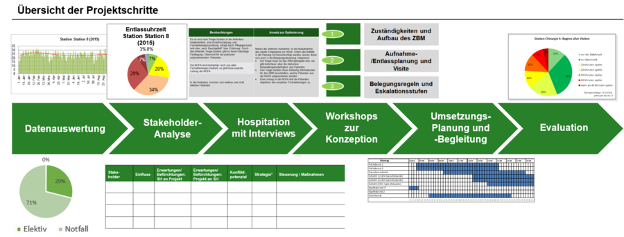 Hierzu legen wir gemeinsam mit der Projektgruppe bzw. dem Auftraggeber des Projekts fest, welche Beschlüsse einer besonders intensiven Umsetzungskontrolle bedürfen. Weitere Erhebungen krankenhausübergreifender oder im Einzelfall auch abteilungsspezifisch relevanter Kennzahlen können je nach Aufwand vereinbart und integriert werden.