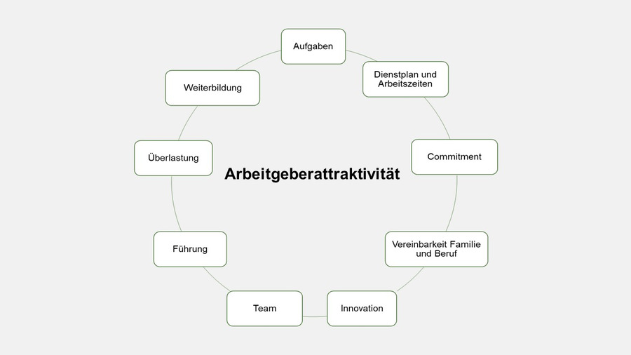 Wer könnte die Arbeitgeberattraktivität Ihres Hauses besser beurteilen als Ihre Mitarbeiter? Daher erfolgt die Messung der Arbeitgeberattraktivität mittels unserer ZEQ-Mitarbeiterbefragung. Diese ist so konzipiert, dass sie die zentralen Aspekte der Arbeitgeberattraktivität erfasst (siehe Abbildung 1).
