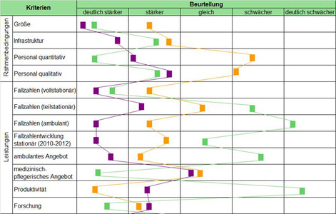 Basierend auf diesen Ergebnissen kann die Konkurrenzanalyse (Abb. 3) Informationen darüber liefern, warum Konkurrenten ggf. erfolgreicher im Einzugsgebiet agieren als die eigene Klinik. Anhand von Internetrecherchen und Veröffentlichungen der Konkurrenz, können diese näher beleuchtet werden und in Bezug auf verschiedene Kriterien mit der fokussierten Klinik verglichen werden.