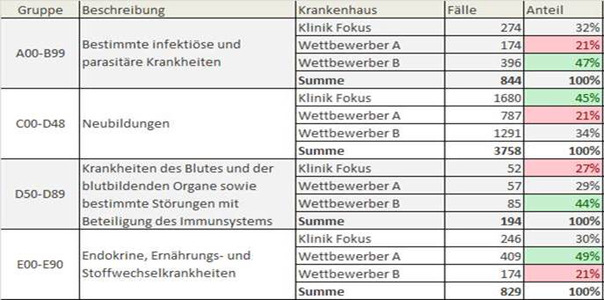 Doch diese Erkenntnis reicht nicht aus, um Wachstumspotenziale zu erkennen und Strategien für die Zukunft zu entwickeln. Es fehlt schlichtweg die Relation zum tatsächlichen Markt. Wie viele Patienten gibt es überhaupt im Einzugsgebiet? Wie ist der Marktanteil des Hauses? Wie ist die Konkurrenz aufgestellt? Und wie ist das Image des Hauses?