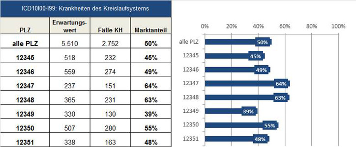 Der erste wichtige Schritt ist die Ermittlung des Potenzials des Marktes anhand der Daten des Statistischen Landesamtes und des Statistischen Bundesamtes. Diese können so aufbereitet werden, dass wir für das relevante Einzugsgebiet die Anzahl der behandelten Patienten nach ICD-Partition ermitteln. Im nächsten Schritt erfolgt dann in der Tat die Aufbereitung der Leistungszahlen des Hauses nach Postleitzahlen und vor allem nach ICD. Ergebnis dieser Marktpotenzialanalyse (Abb. 1) sind damit Informationen über die potenziell zu erwartenden Patienten pro ICD-Partition im Einzugsgebiet und der aktuelle Marktanteil des Hauses gemessen an der potenziellen Patientenzahl.