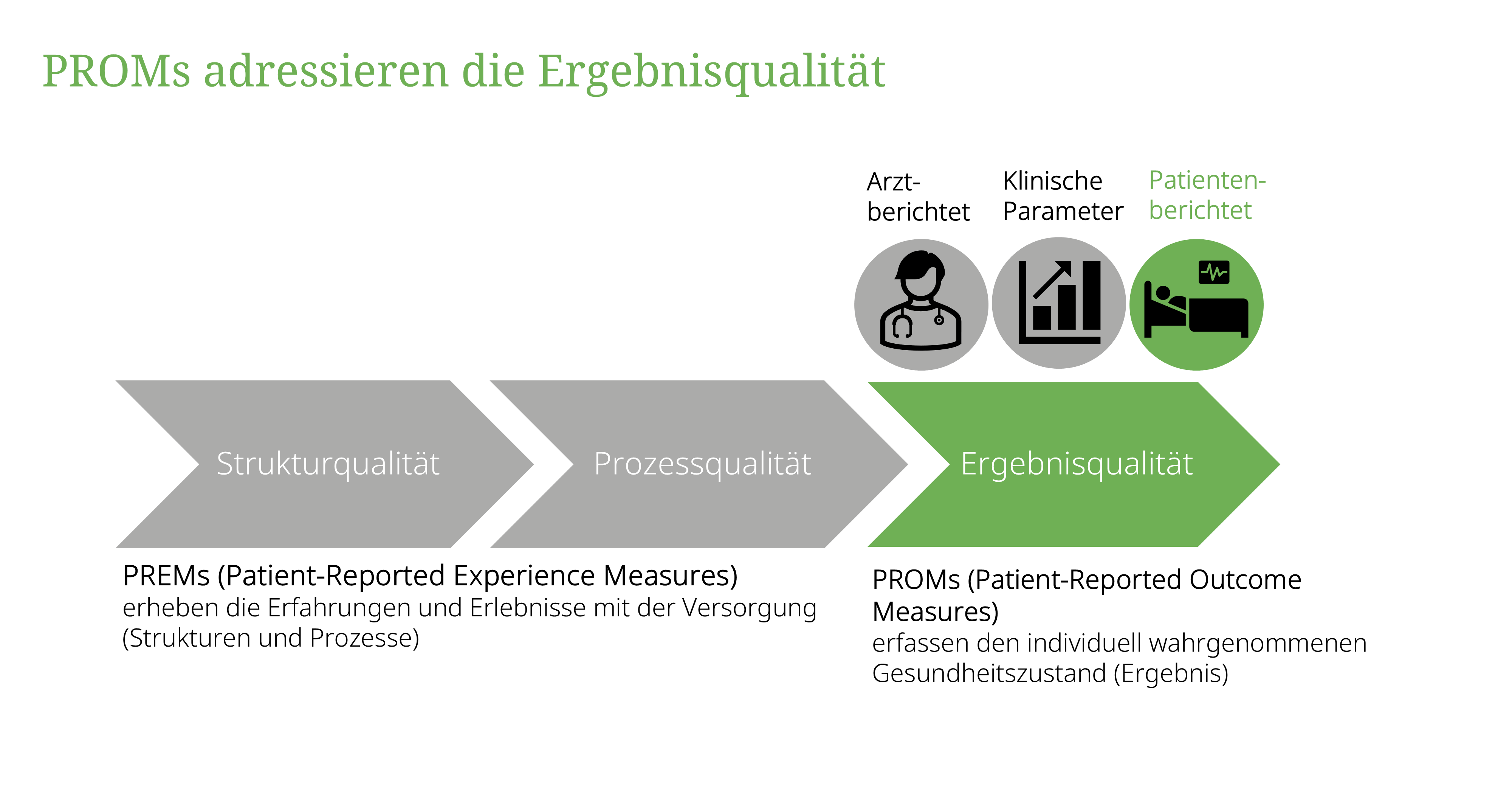 Als etablierte Messinstrumente stehen dafür Patient-Reported Outcome Measures (PROMs) (dt. patientenberichtete Ergebnismessungen) zur Verfügung. PROMs sind standardisierte und validierte Messinstrumente, bei denen PatientInnen direkt den eigenen Gesundheitszustand bewerten, ohne Interpretation einer anderen Person (z. B. Ärzte, Therapeuten, Angehörige). Sie erfragen zum Beispiel die Funktionsfähigkeit, wahrgenommene Therapieeffekte, Leistungsfähigkeit, Symptomatik sowie deren Einfluss auf ihre Alltagsbewältigung und das allgemeine Wohlbefinden. Dadurch bilden PROMs einen wichtigen Bestandteil für die Gesamtbeurteilung einer medizinischen Intervention.