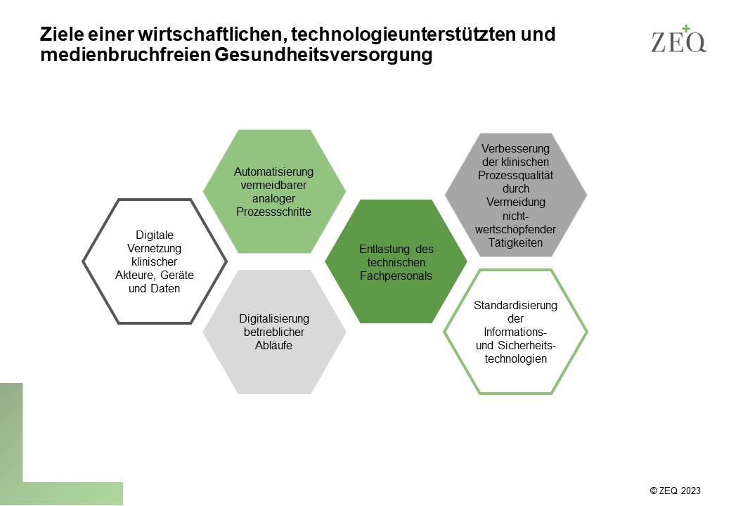 Auf der Grundlage langjähriger operativer Erfahrung im prozessorientierten Technologiemanagement einschließlich umfassender Technologiepartnerschaften wollen wir (ZEQ) Kliniken dabei unterstützen, mit innovativen Betriebsformen schneller, kosteneffizient und sicher eine erfolgreiche Zukunft zu gestalten.