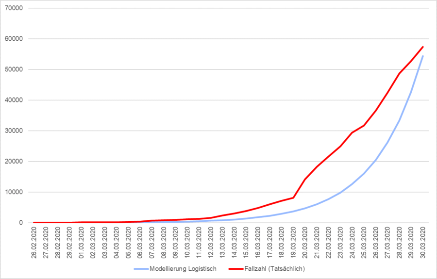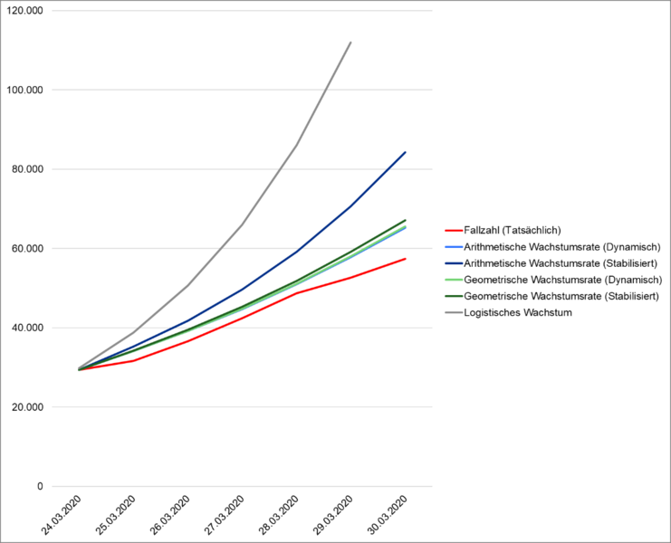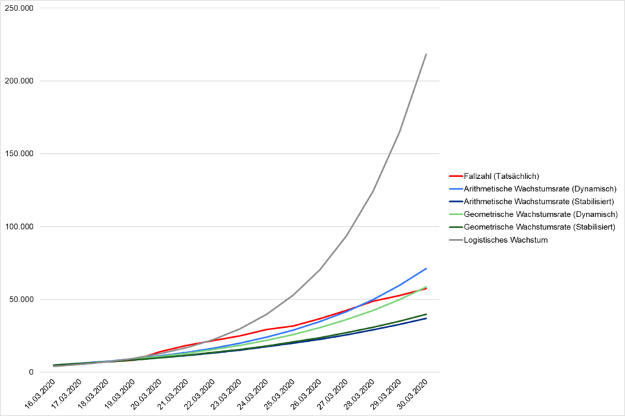 Für die nationale Entwicklung (und damit für die Prognose auf Basis des Bevölkerungsanteils sowie alle Prognosen auf Basis der bundesweiten Wachstumsrate) müssen wir zusätzlich andere Wachstumsprognosen prüfen. Insbesondere die bereits erläuterte logistische Wachstumsrate, die sich in epidemiologischen Simulationen als prognostizierte Entwicklung zeigt, könnte für die mittel- bis langfristige Prognose von zentraler Bedeutung sein. Wir haben daher auf Basis der Fallzahlentwicklung eine Modellierung mit den verschiedenen Methoden vorgenommen und die jeweils prognostizierten Fallzahlen mit den tatsächlichen Zahlen abgeglichen. An dieser Stelle muss betont werden, dass durch die unzureichende Datenbasis ein wirklicher Abgleich natürlich keine Beweiskraft hat, sondern nur Hinweise auf die tatsächlichen Zusammenhänge bieten kann.