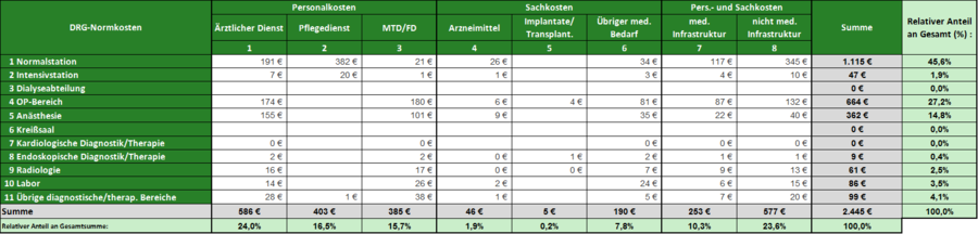 So kann man also für jede einzelne DRG erkennen, welche Kosten in welchem Bereich durchschnittlich anfallen und dementsprechend über die DRG vergütet werden. Gliedert man nun die eigenen Kosten auf die entsprechenden Kostenstellen und Kostenarten auf und stellt sie den DRG-Normkosten gegenüber, kann man sehr genau sehen, in welchen Bereichen die eigenen Kosten über die DRG gedeckt sind und in welchen Bereichen nicht.