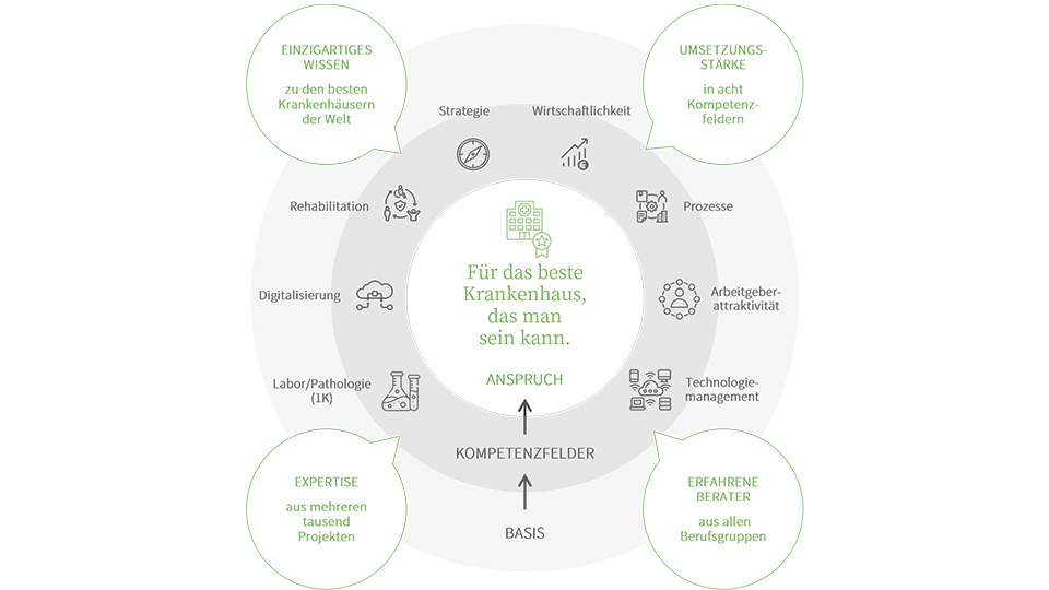 Damit wir diesem Anspruch gerecht werden können, haben wir uns ausschließlich auf das Gesundheitswesen spezialisiert. Zu unseren Kunden zählt ein Großteil der deutschen Gesundheitseinrichtungen – darunter mehr als die Hälfte der Universitätskliniken, eine Vielzahl privater und öffentlicher Klinikverbünde, Maximalversorger, Psychiatrien und Rehabilitationskliniken. Um hier ideal beraten zu können, haben wir unser Unternehmen strategisch auf die Identifikation und Analyse der weltweit besten Krankenhäuser ausgerichtet. Die dabei entdeckten best practices lassen wir in unsere Projekte und Maßnahmenempfehlungen einfließen.