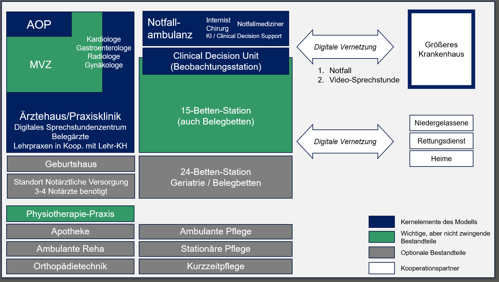 Die Grundidee besteht in einer intensiven Vernetzung verschiedener Versorgungsstufen. Vor Ort verbleibt eine relativ kleine stationäre Einheit, die durch ambulante Strukturen unterstützt wird. Des Weiteren erfolgt eine digitale Anbindung eines breit aufgestellten Kooperations-Krankenhauses oder mehrerer Fachkliniken. So spielt die Digitalisierung bei der Vernetzung der Leistungserbringer, aber auch bei der Einbeziehung der Patientinnen und Patienten eine herausragende Rolle.
