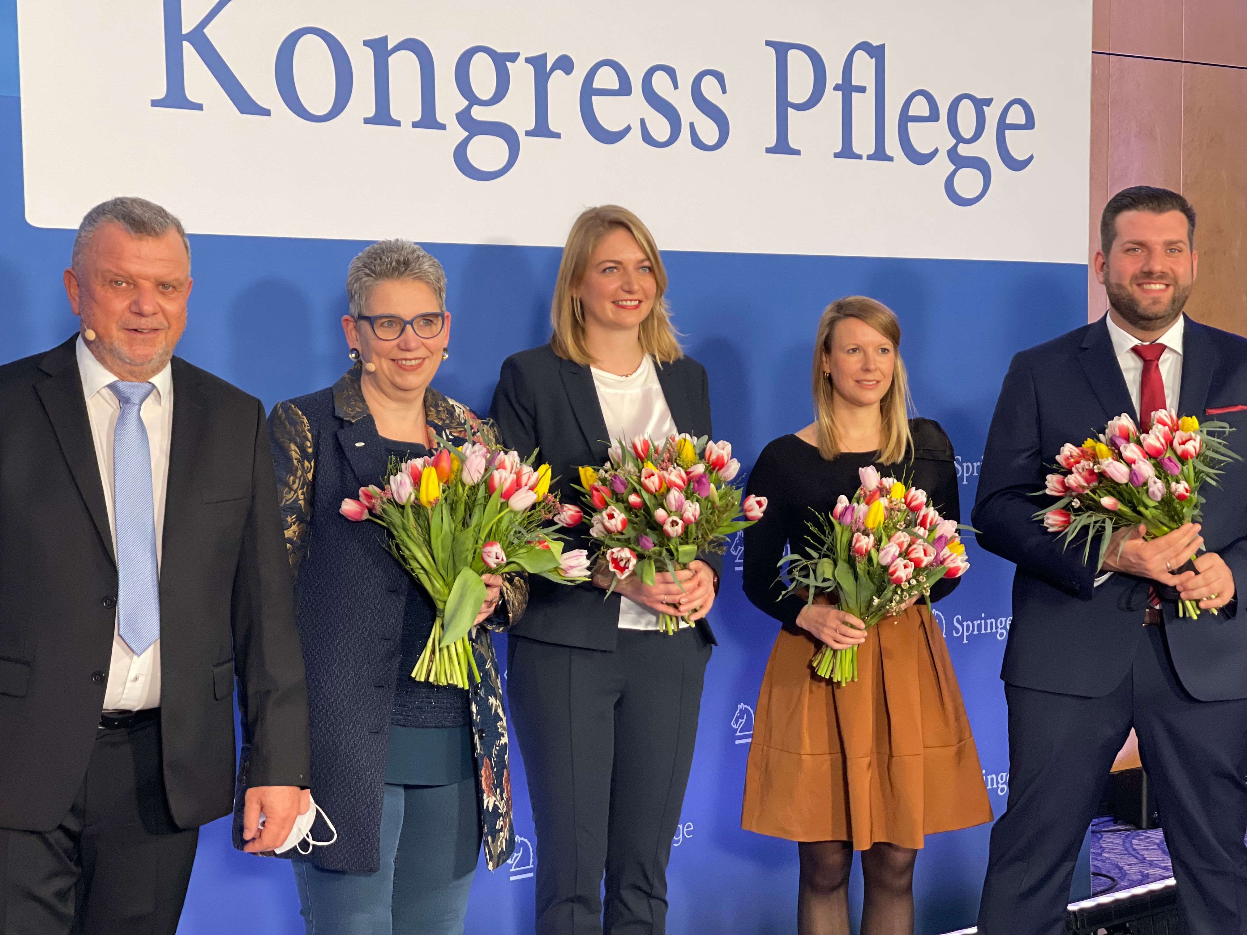 Verleihung des Pflegemanagement-Award 2022: v.l.n.r. Peter Bechtel, Christine Vogler, Elena Wuzel, Julia Mayer, Sebastian Söllner (alle 2G+) // Bildquelle: © Bundesverband Pflegemanagement e.V.