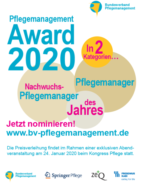 Für den Pflegemanager 2020 sind in diesem Jahr erstmalig die Leser der Zeitschriften „Pflegemagazin Heilberufe“, „Pflegezeitschrift“ sowie „CNE Pflegemanagement“ gefragt, Kandidaten aus allen pflegerischen Bereichen vorzuschlagen. Damit soll eine breitere Öffentlichkeit die Möglichkeit zur Nominierung preiswürdiger Kandidaten erhalten. Die Kriterien bleiben unverändert anspruchsvoll. Es werden Pflegemanager der Top-Ebene gesucht, die die pflegerische Gesamtverantwortung für eine Einrichtung innehaben, durch nachhaltiges und innovatives Handeln überzeugen, ganzheitlich und ergebnisorientiert denken, Vorbildfunktion haben und sich für die Stärkung der Profession und des Nachwuchses einsetzen. Auf Basis der Vorschläge recherchiert der Bundesverband Pflegemanagement Details zu den Kandidaten und eine hochkarätige Jury wählt schließlich den Preisträger 2020. Weitere Infos zum Auswahlverfahren finden Sie unter Pflegemanager des Jahres.